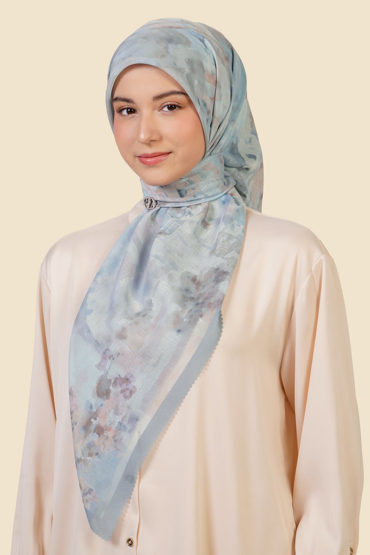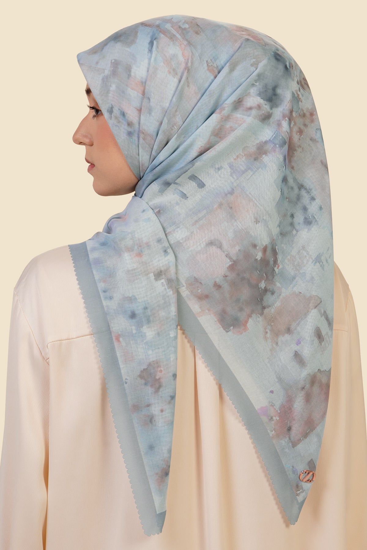 Inspired by the timeless charm of Santorini, this scarf captures the serene beauty of the island where soft blue skies meet sun-washed architecture and tranquil coastal views. The design blends watercolor-like textures with subtle earthy tones, reflecting the calm landscapes, stone pathways, and breezy Mediterranean atmosphere that define Santorini.